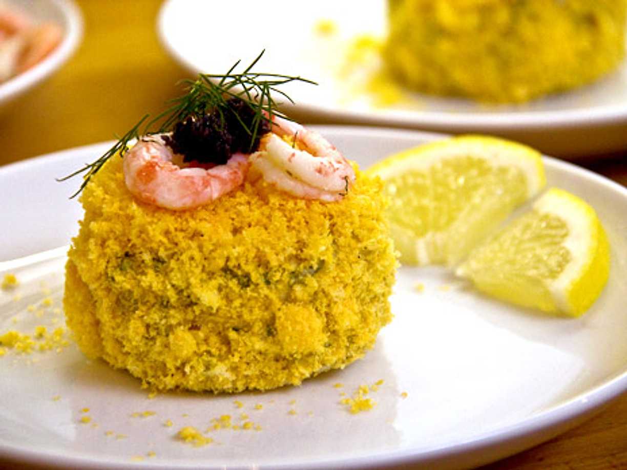 En bakelse till förrätt! Smulade ostbågar, räkor och svart kaviar garnerar denna smörgåstårta i miniformat.