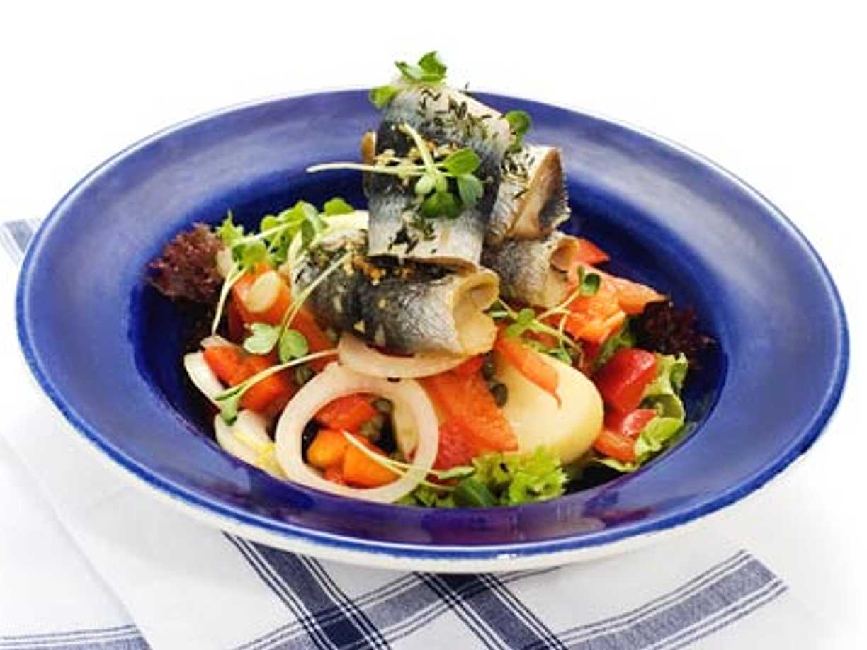 Lägg upp grönsaksblandningen på några salladsblad och placera sedan strömmingarna ovanpå. Garnera med körvel.