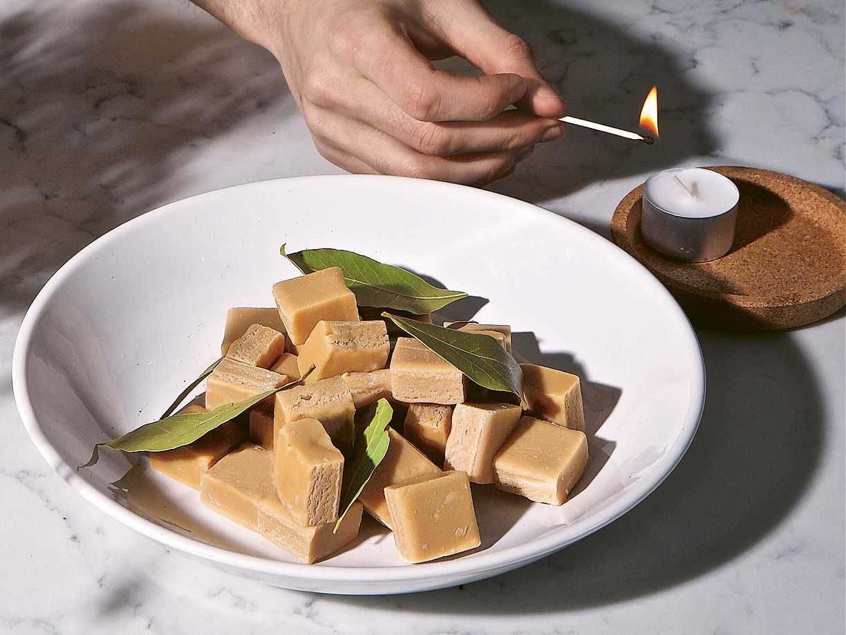 "Jag gillar att ge efterrätter smaker man ofta förknippar med annat än just desserter. Lagerblad är för mig starkt förknippat med grytor, eller som smaksättning när man kokar hederlig kokkorv. Här har jag valt att använda mig av lagerblad i fudge, vilket blir väldigt gott och spännande. Den här fudgen är perfekt att ställa fram på bordet för att dela på efter middagen." /Adam Thulin