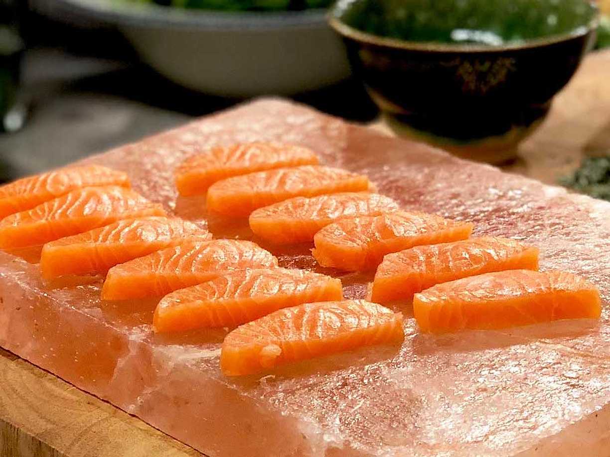 Läcker rätt med lax som tillagas på saltsten och sotas med en brylébrännare. Till laxen serveras potatis på rosmarinspett, tomater och rostat bovete.