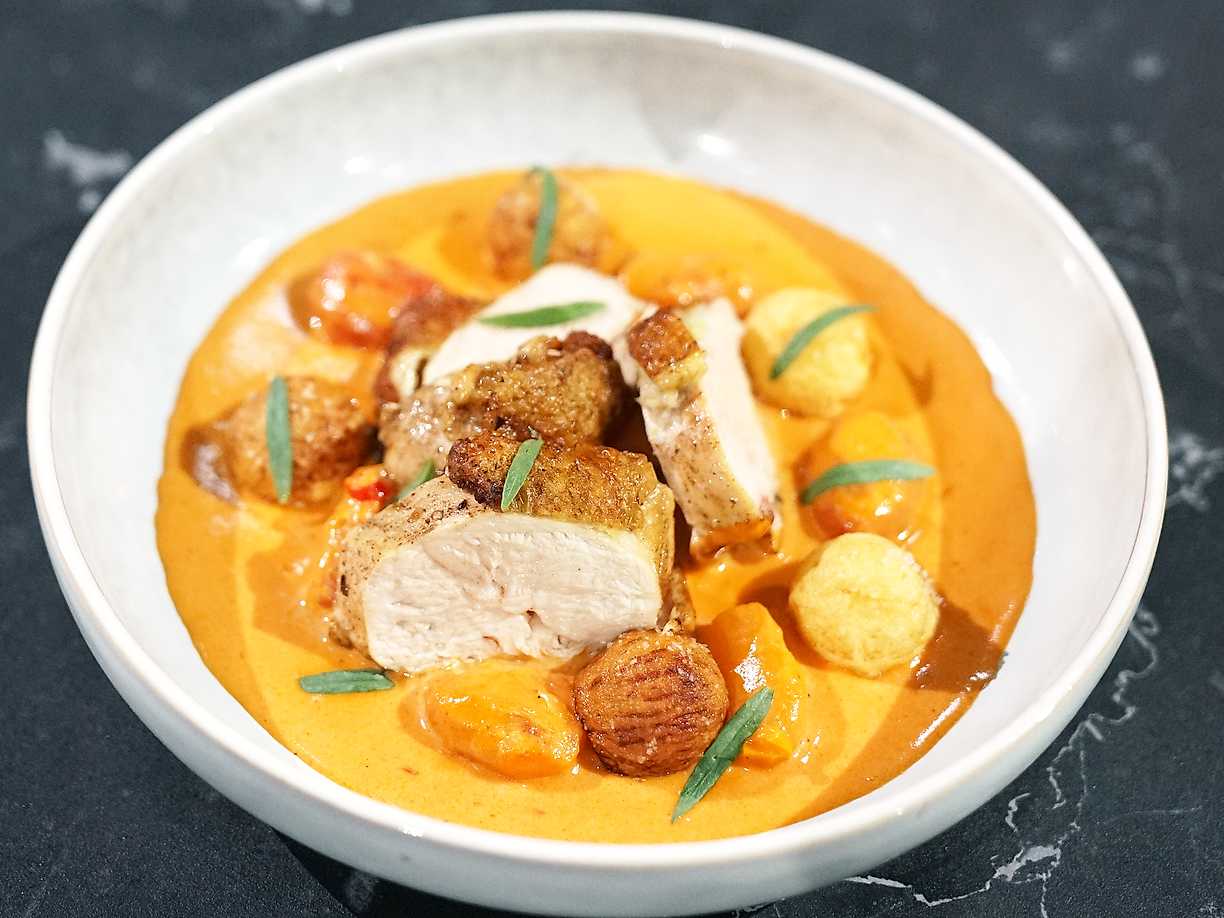 Ört- och vitlöksstekt kyckling serveras i Sebastians vinnande rätt på en krämig sås på tomat och chilifrukten piri tillsammans med frasigt friterade potatiskulor.