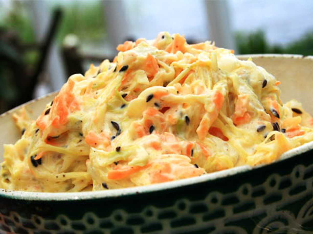 - Skala och riv morötterna grovt på ett rivjärn och blanda med kålen i en skål. Rosta kumminfröna i en torr stekpanna och häll dem över grönsakerna.