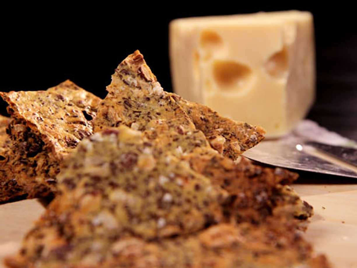 Snabbt och knäckebröd med hasselnötter, linfrö, solroskärnor. Detta knäckebröd är glutenfritt och bakas på majsmjöl.