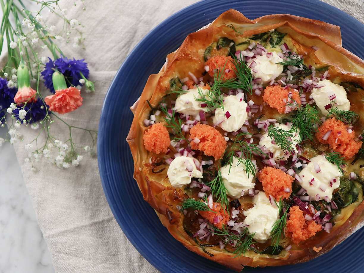 Gör en ostpaj med krispig filodeg som botten, det blir både enkelt och gott! Toppa pajen med röd rom, smetana, rödlök och dill efter den gått klart i ugnen.