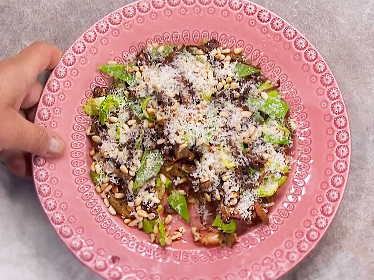 Toppa med de rostade hasselnötterna och riv lite parmesan över.