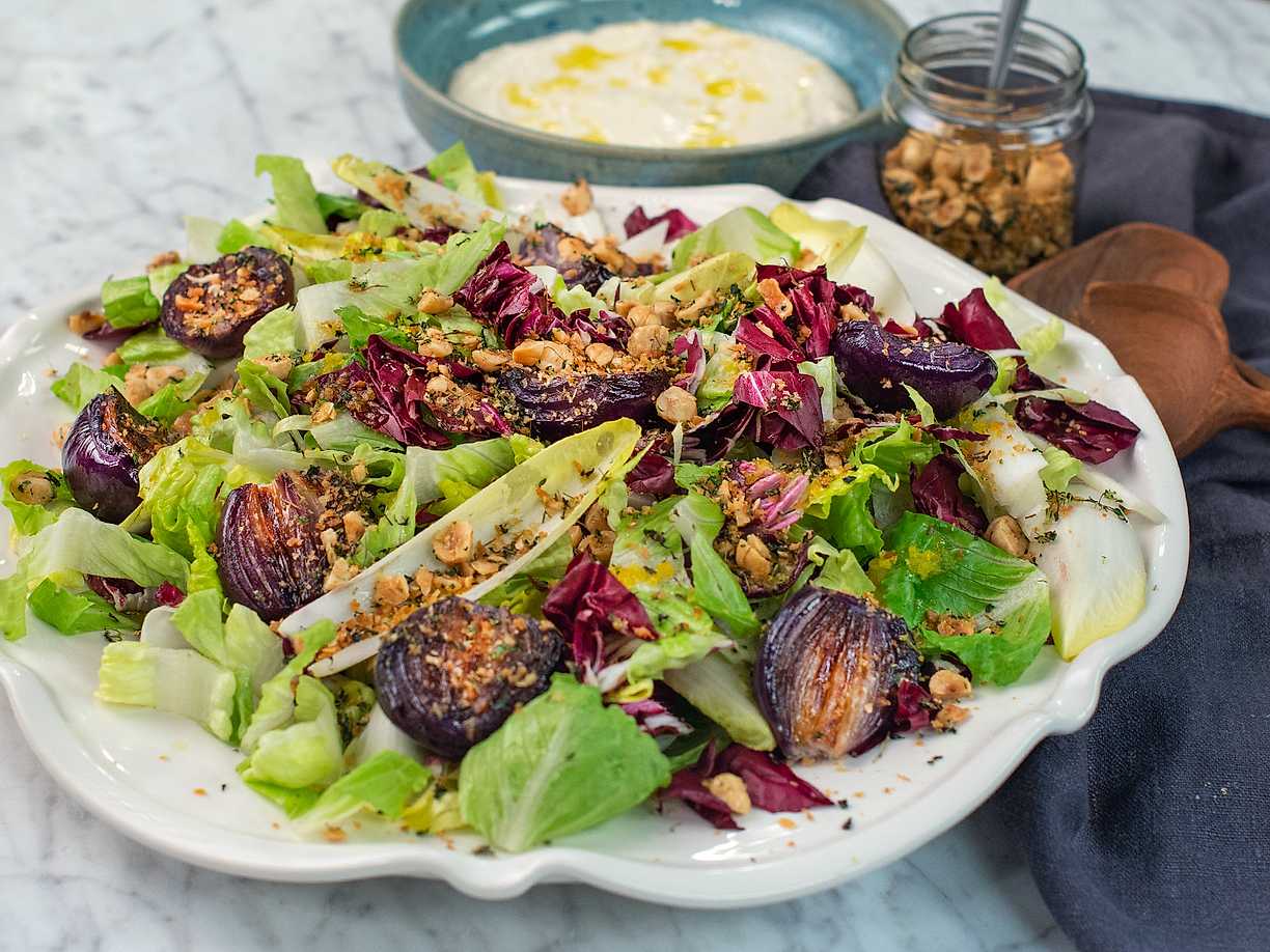 En vintersallad på bittra blad med fantastiska smaker! Söt mjukbakad rödlök, en krämig och lite syrlig getostkräm och ett smörstekt krisp på panko och hasselnötter blir tillsammans en perfekt och matig middagssallad.