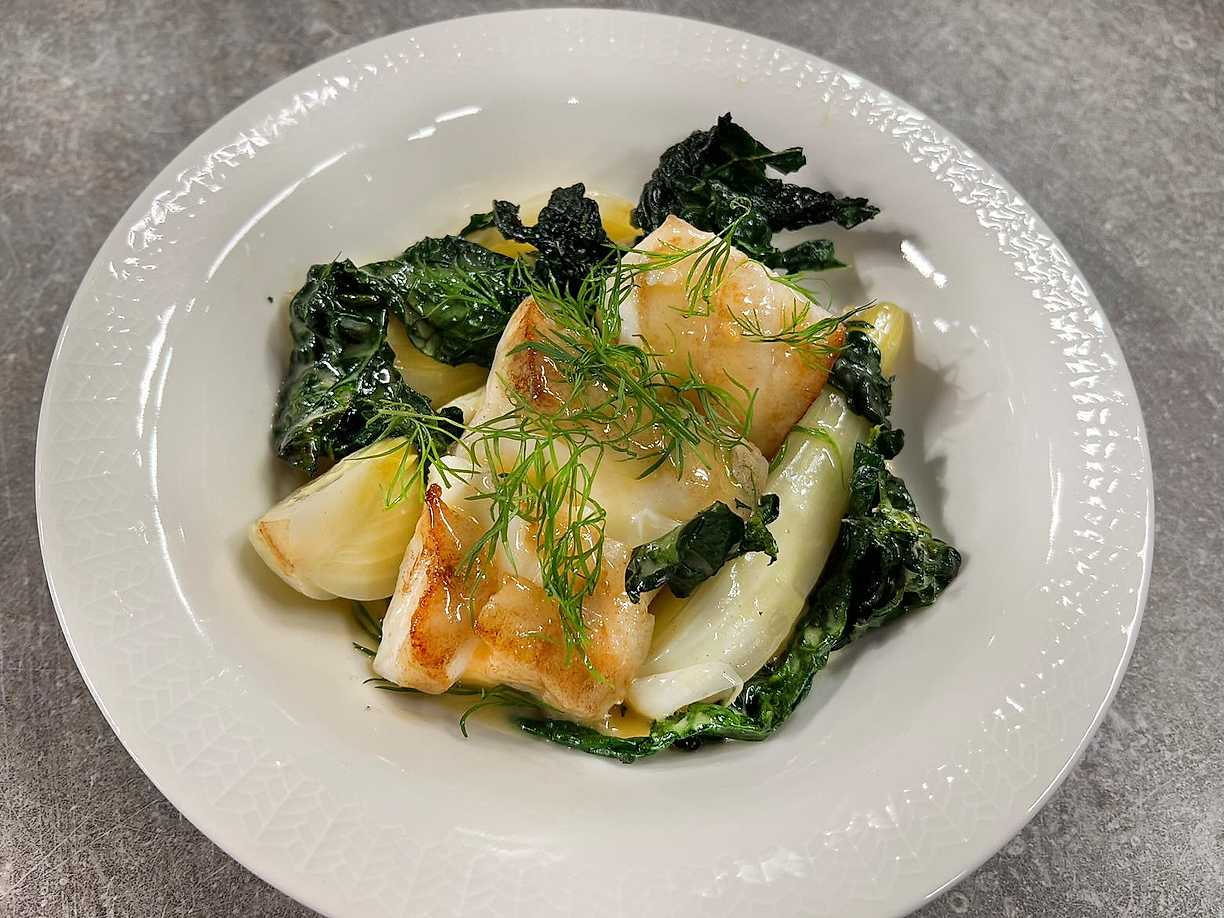 Lägg 2–3 bitar fänkål i botten på en djup tallrik. Toppa med svartkålen. Lägg torsken centrerat i tallriken. Toppa med sås och fänkålsdill.